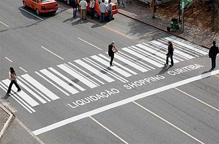 巴西這條斑馬線,將斑馬線變成商品條碼,像在提醒人們,快快來消費,馬路上還大剌剌的寫上購物中心的名稱!